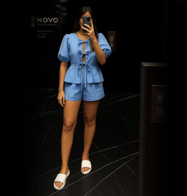 Step into easy elegance with the Azure Breeze Co-ord Set, crafted in soft breathable cotton with a flattering tie-front design. The puffed sleeves and flowy peplum top paired with tailored shorts make this set the perfect balance of comfort and charm — ideal for brunches, getaways, and summer evenings.