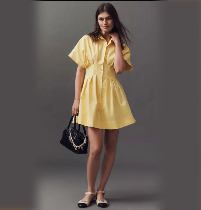 Shirt collar and front button closure Subtle puff sleeves for added charm Flared pleated skirt for a flattering A-line fit Lightweight and unlined for warm-weather comfort Styling Tip: Pair it with a charm-detailed black handbag (like in the pic), dainty jewelry, and strappy flats or espadrilles for a sweet, elevated look.