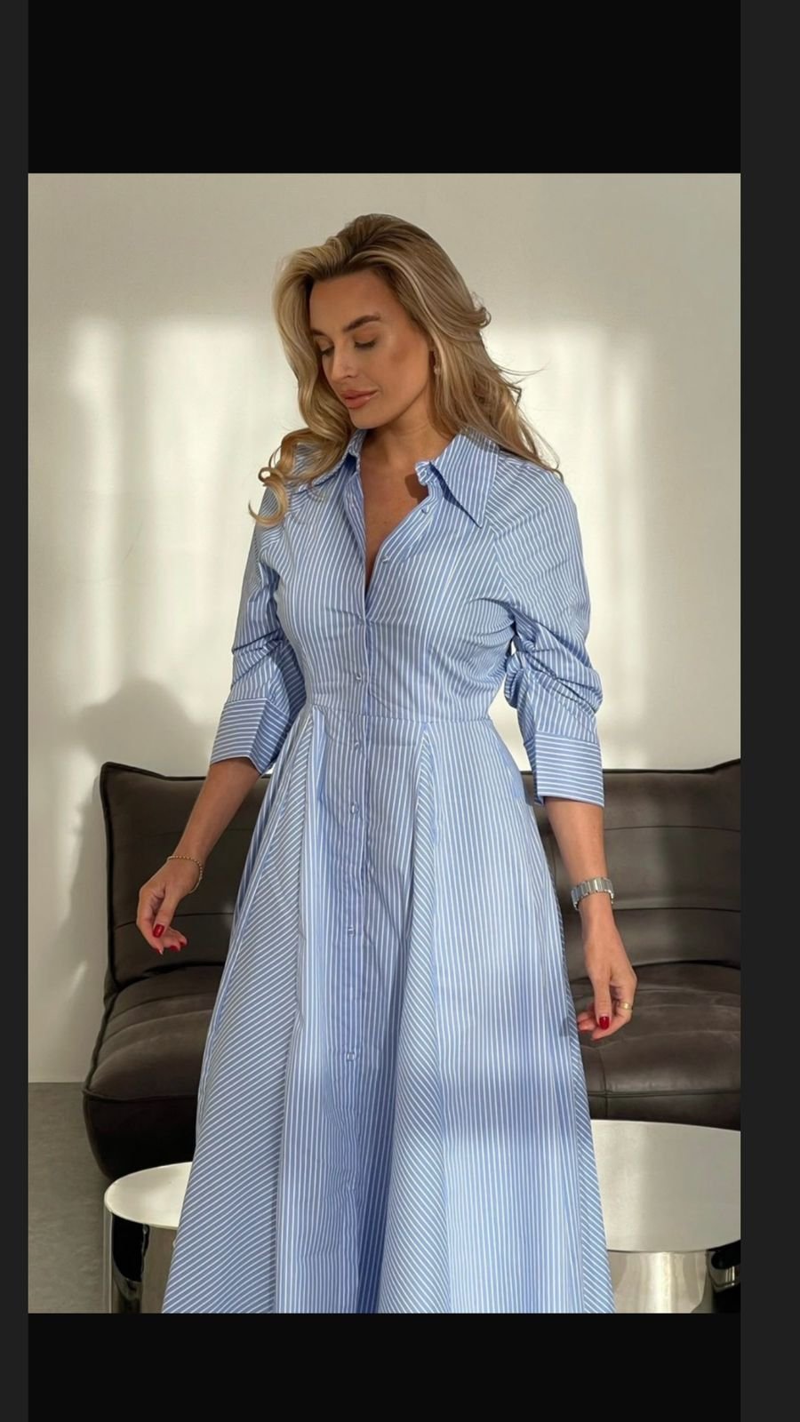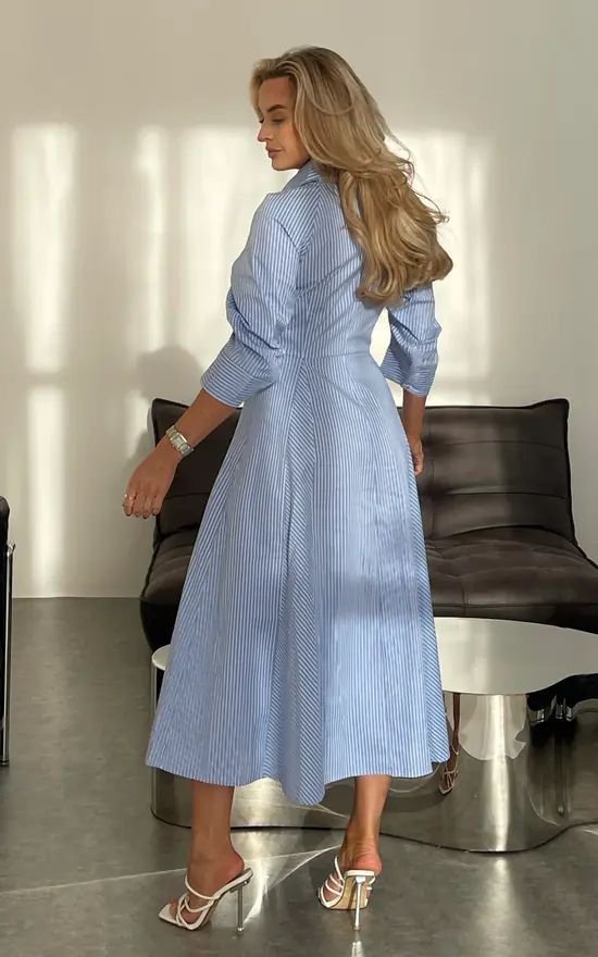 Elegance meets everyday ease in our Classic Blue Pinstripe Dress. With its tailored bodice, full-length button front, and flattering flared skirt, this dress gives timeless shirt-dress energy with a modern, feminine twist. The vertical stripes elongate the silhouette, while the cinched waist highlights your curves without compromising comfort. Perfect for office wear, brunches, or effortless city strolls.