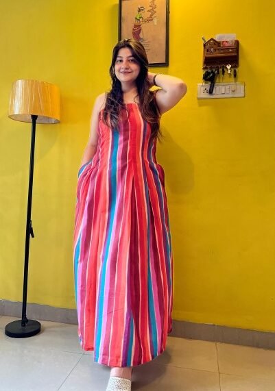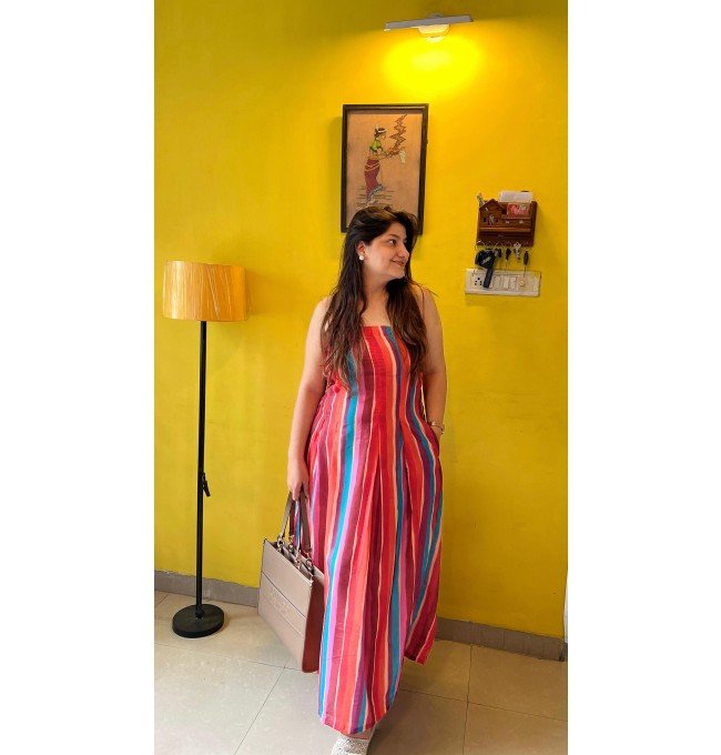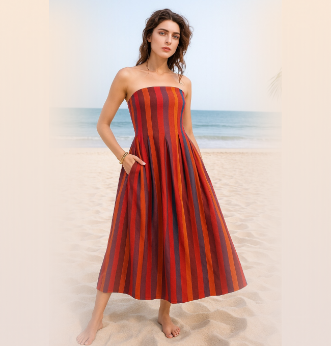 Step into sunset vibes with our Sundown Stripes Tube Dress — a bold strapless maxi that’s made to stand out. Crafted in rich multicolor vertical stripes, this dress features a structured bodice, soft pleats from the waist, and hidden pockets for comfort and flair. Whether it’s a beach vacation or a resort dinner, this one’s an effortless head-turner.