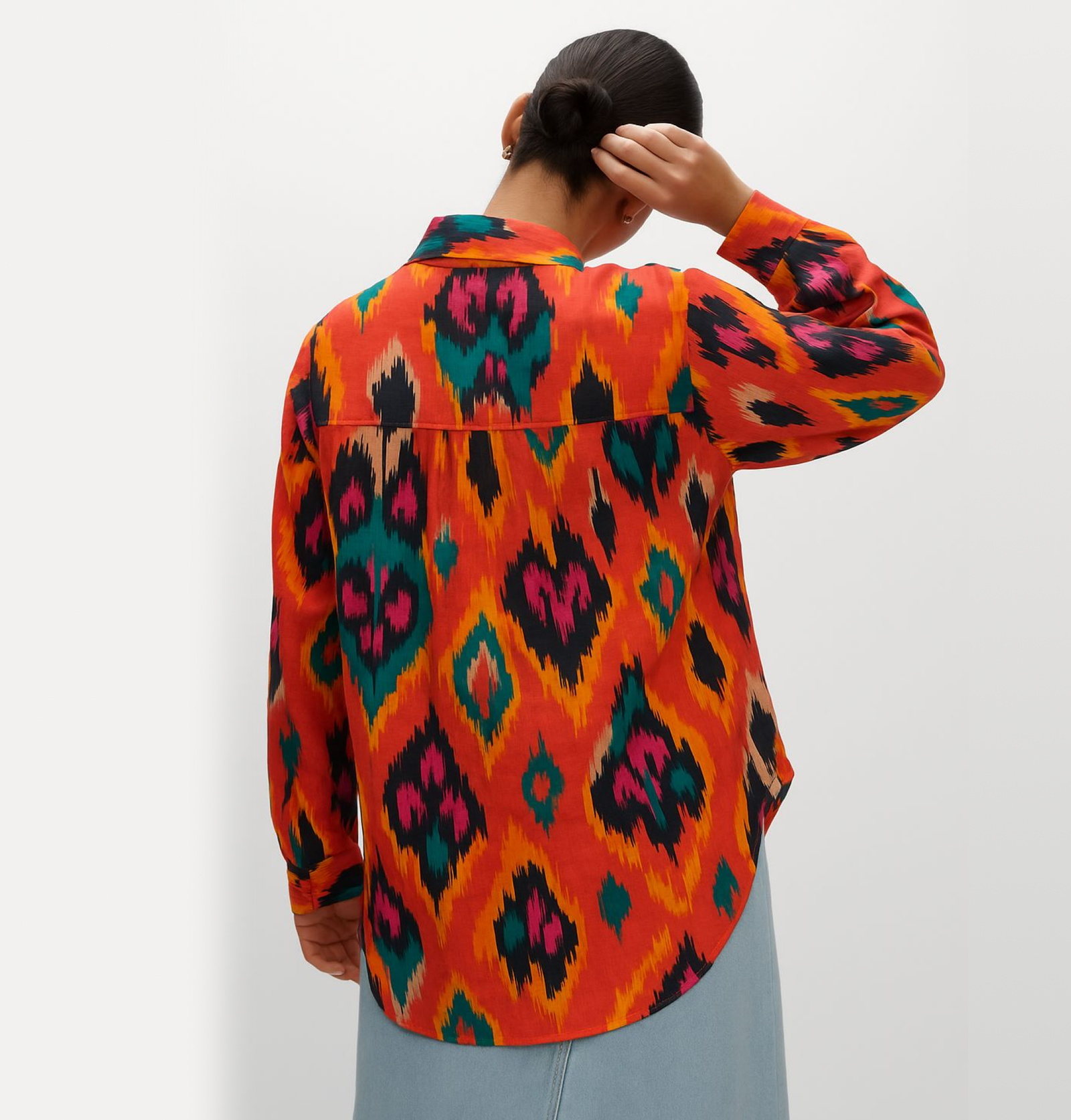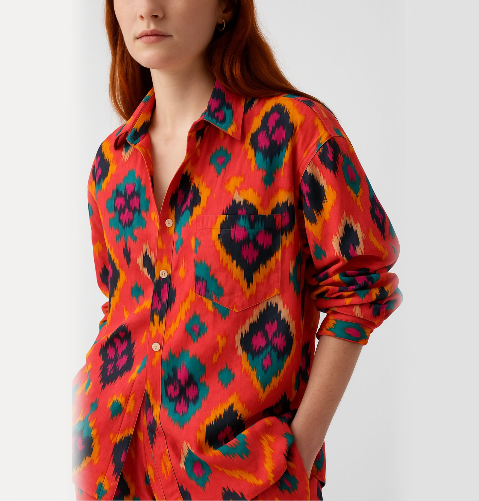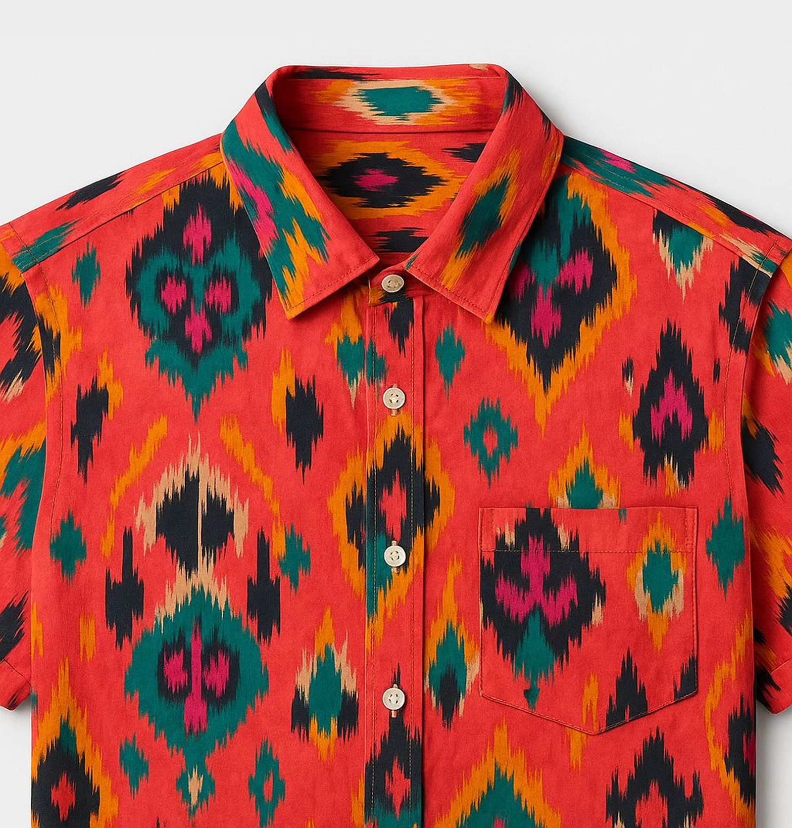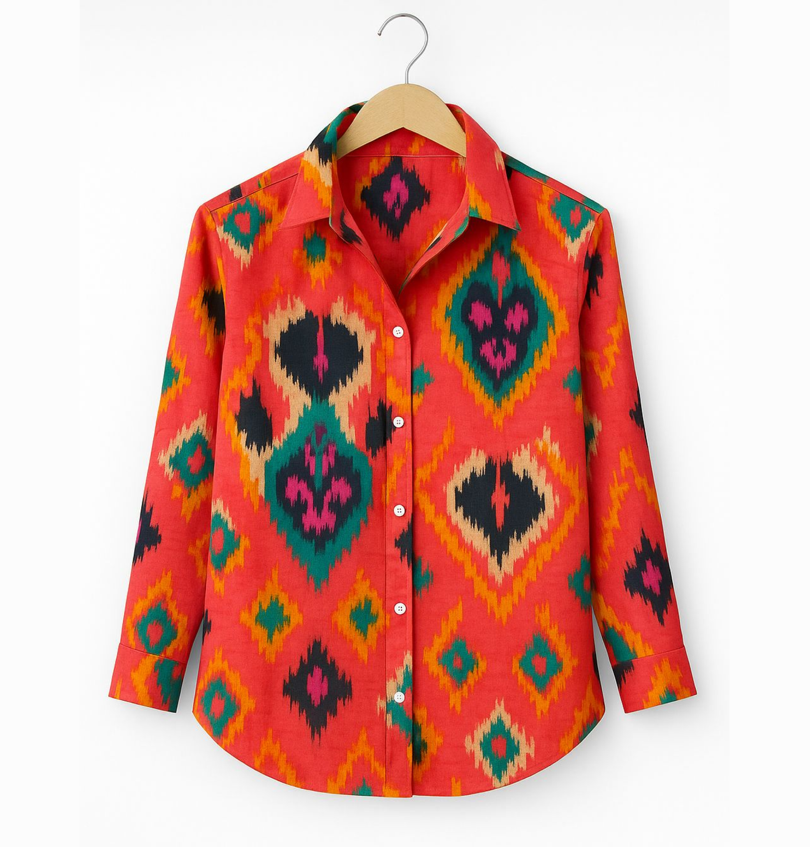 Ignite your wardrobe with our Wild Ember Ikat Shirt – a statement piece that celebrates bold colors and timeless craft. Featuring a vibrant ikat weave in fiery reds, deep teals, and electric oranges, this shirt effortlessly blends tradition with modern-day chic.